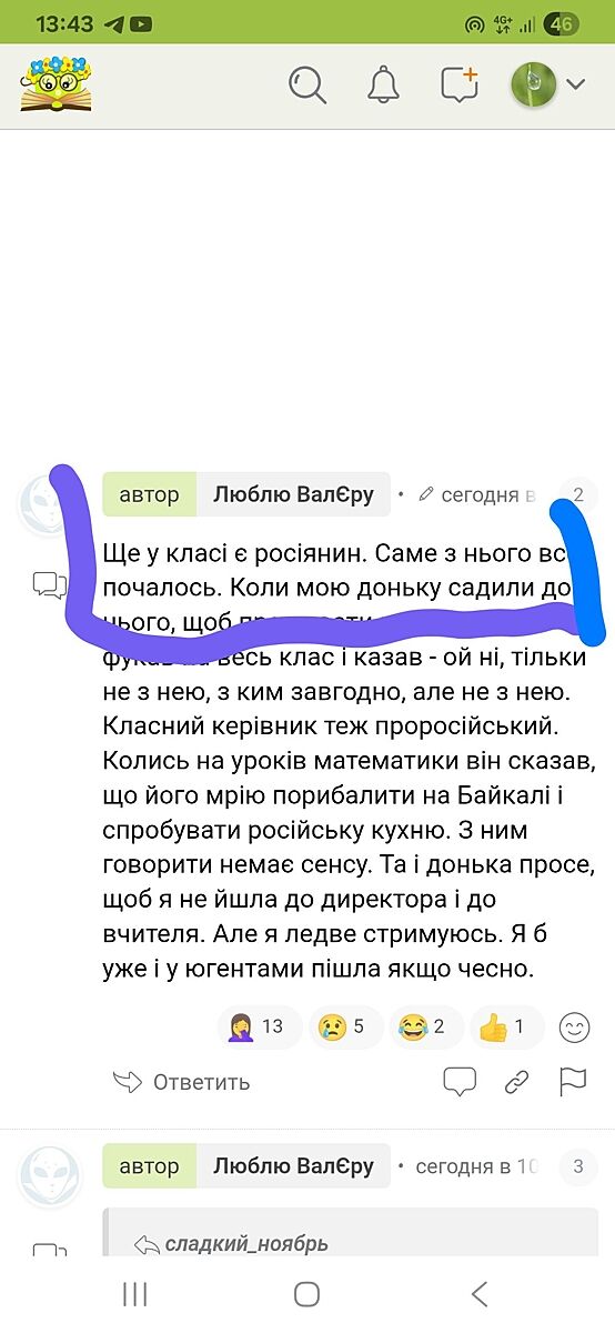 Ще у класі є росіянин. Саме з нього все почалось. Коли мою доньку садили до нього, щоб працювати по парам, він фукав на весь клас і казав - ой ні, тільки не з нею, з ким завгодно, але не з нею. Класний керівник теж проросійський. Колись на уроків математики він сказав, що його мрію порибалити на Байкалі і спробувати російську кухню. З ним говорити немає сенсу. Та і донька просе, щоб я не йшла до директора і до вчителя. Але я ледве стримуюсь. Я б уже і у югентами пішла якщо чесно.