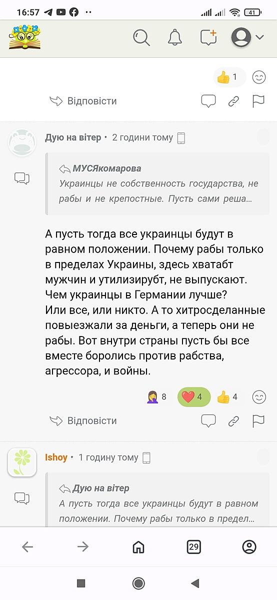 Давайте проверим Ваши способности к читанию и пониманию прочитанного: «А пусть тогда все украинцы будут в равном положении. Почему рабы только в пределах Украины, здесь хватабт мужчин и утилизирубт, не выпускают. Чем украинцы в Германии лучше?»