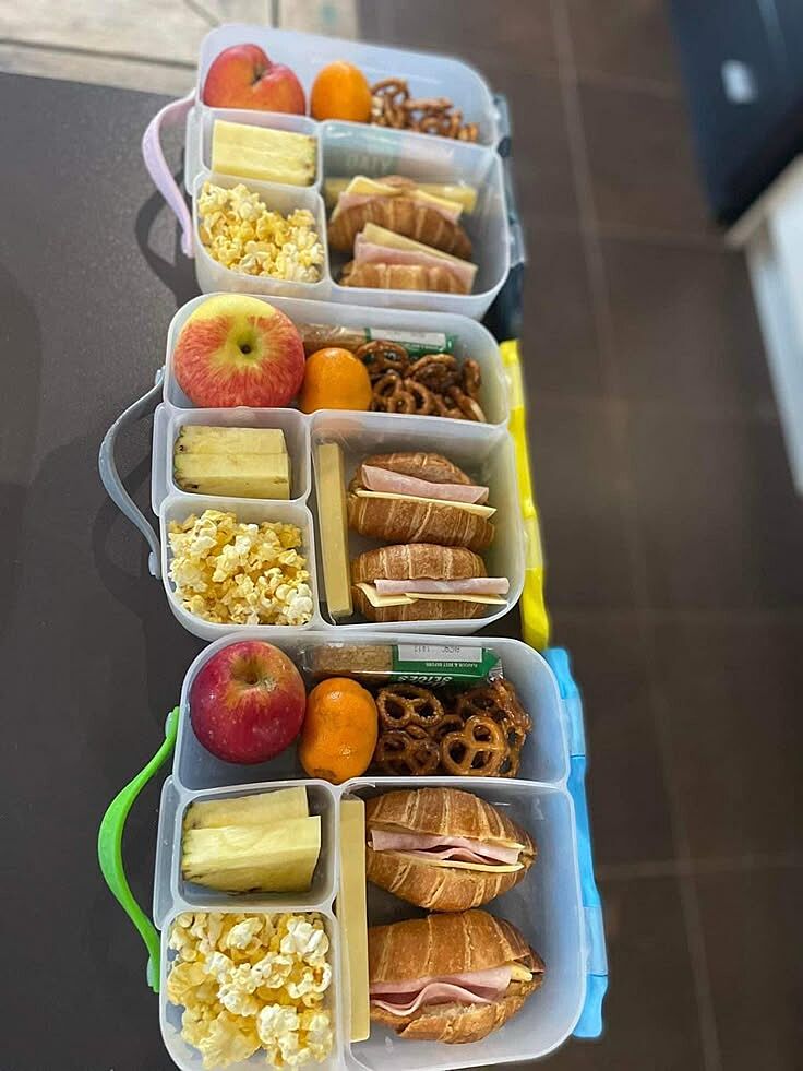 Я давала типу шаурму- в лаваш загортала м´ясо або балик або ковбасу сиров´ялену, сир, огірок/помідор(тільки без насіння, саму мякоть), листя салату або пекінку, заправляла солодкою гірчицею і трохи кетчупу. Або блинчики з начинкою. Готові пусті круасани купувала і теж туди начинку як в шавуху. Як було натхнення - пекла сосиски в тісті або котлети в тісті. Ну і все в принципі, якісь готові страви типу котлет, каш, вермишелі, тушкованого мяса не брав категорично, це типу було ’відстій’)))