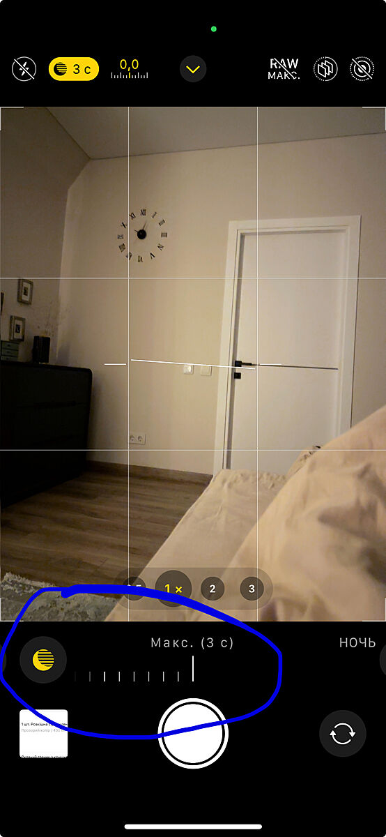 Ничего не надо в настройках менять, просто выбираете в режиме «фото» выдержку максимум. Айфон сам определит, в зависимости от освещенности, какой именно максимум должен быть. Сейчас у меня подсветка горит, поэтому 3с. На улице в темноте до 30 с бывает.