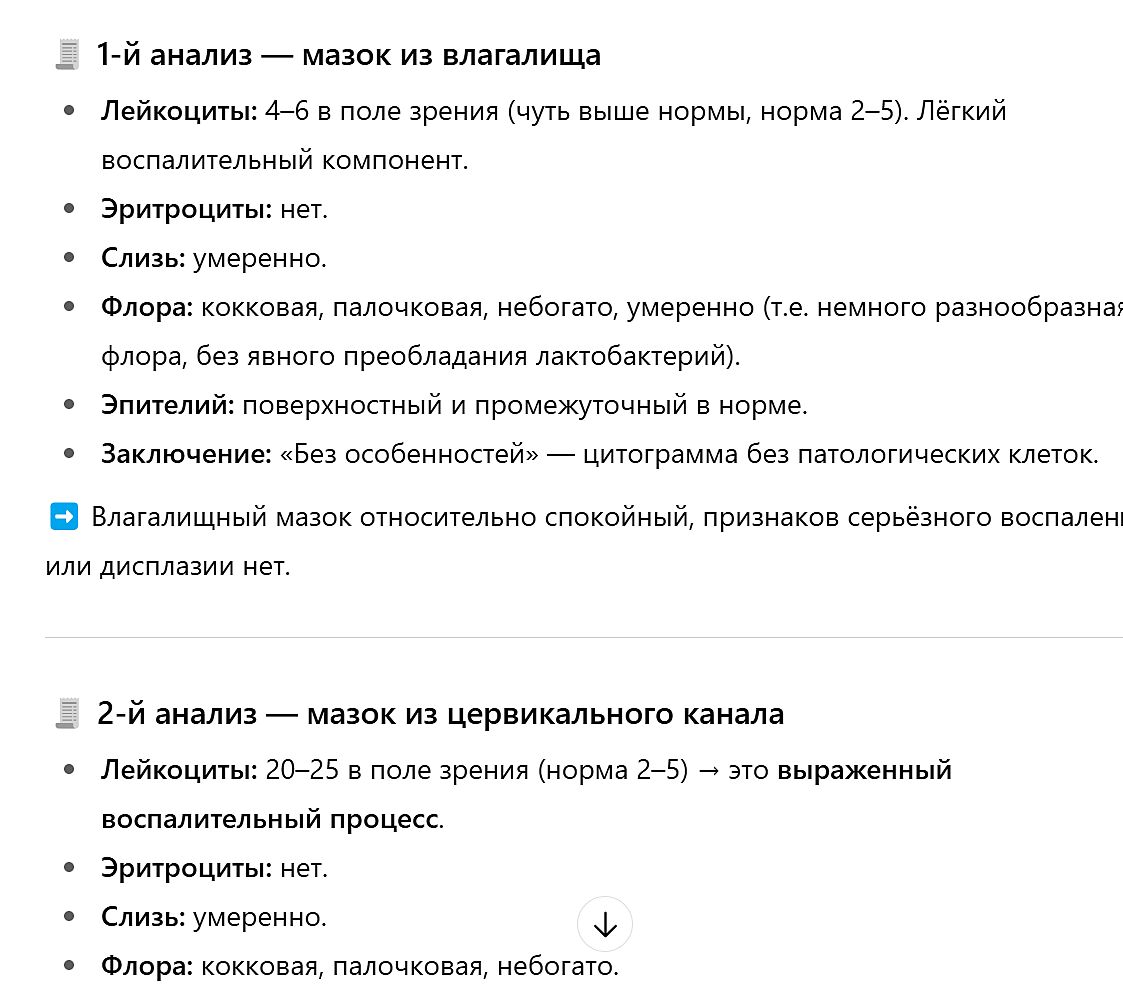 Создавал тут тему что болел живот. Думала тоди боли из-за эндометриоза, то ли кишечник. пошла к врачу. На осмотре врачу всё понравилось, узи тоже. . взяла мазок. вот пришли анализы, врач в отпуске....пошла с просилу у чата жпт. Подскажите из-за чего может быть