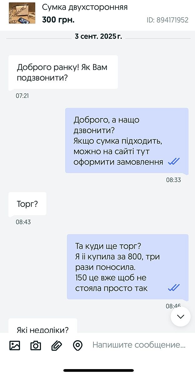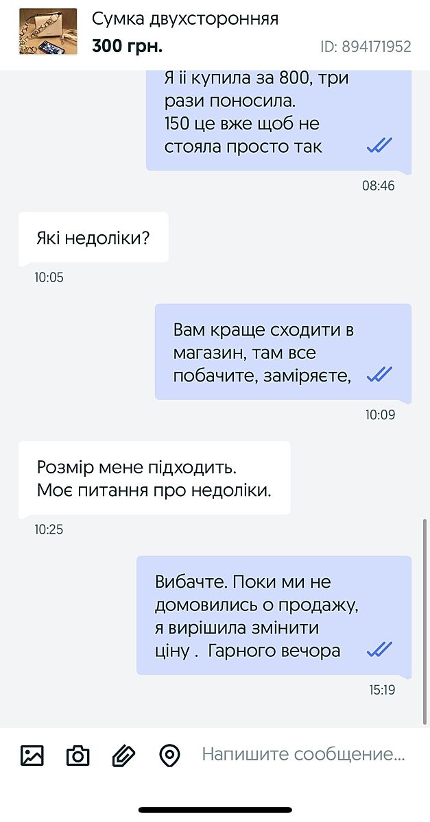 У меня выторговывался раз на 50 грн. В итоге меня еще обвинили что это я торгуются и зажала 50 грн. Я говорю что никого не держу сайт большой. А мозг выносили. Я продавала вещь просто не подошла и цена чисто за ту цену, что брала. Так как везде намного дороже. И итог, пишет ну ладно давай заберу уже высылай. Я отменяю заказ обычно, и в блок. Зачем у меня такой плохой заказывать.