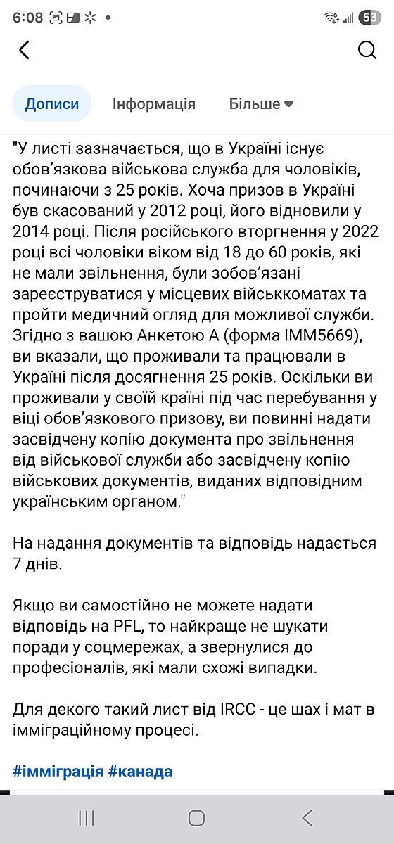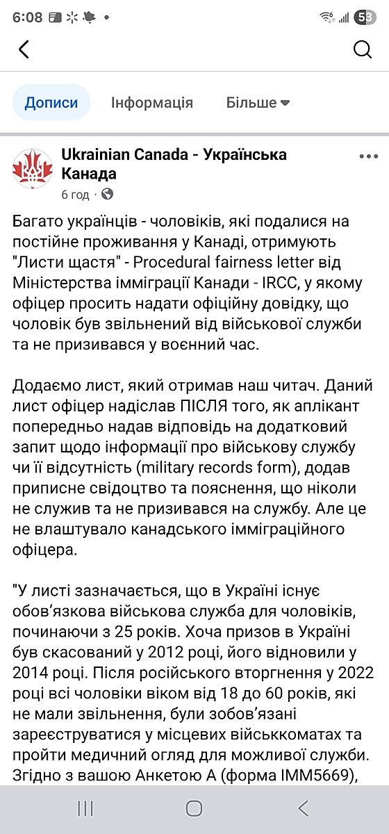 Багато українців - чоловіків, які подалися на постійне проживання у Канаді, отримують ’Листи щастя’ - Procedural fairness letter від Міністерства імміграції Канади - IRCC, у якому офіцер просить надати офіційну довідку, що чоловік був звільнений від військової служби та не призивався у воєнний час.