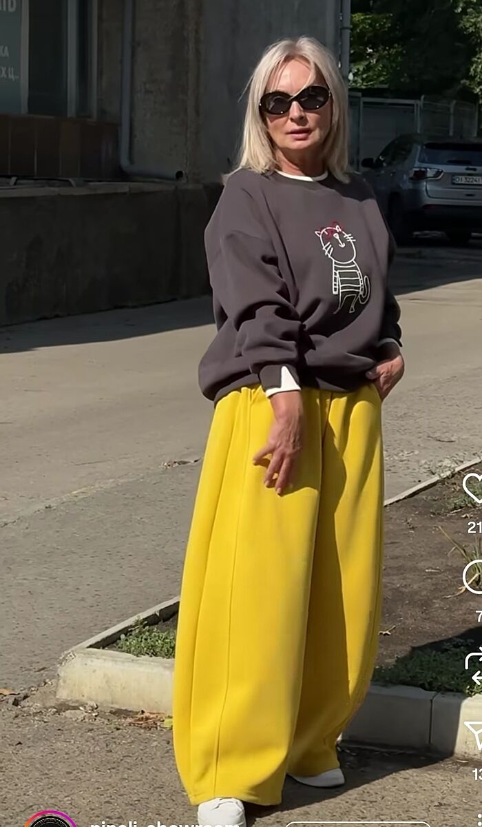 Мне понравился свитшот с котом. Штаны широченные семафорные. Плащ страшненький фасон, цвет старого ватника.