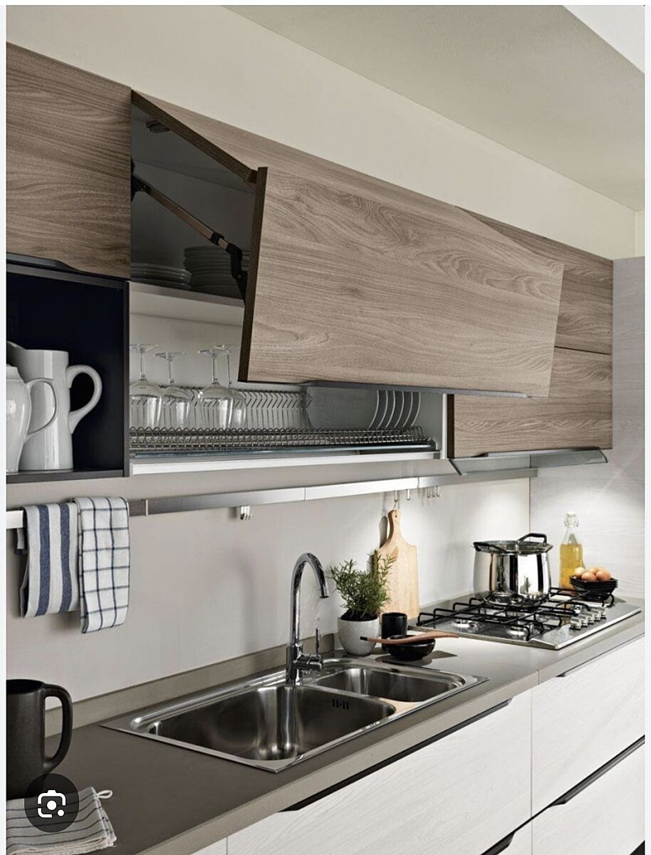 Самый лучший вариант ( проверено в своей кухне) и об этом говорят дизайнеры, чтобы верхние шкафы открывались таким образом, как на фото. Головой не ударитесь это точно. И самый лучший долговечный механизм открывания это Blum.