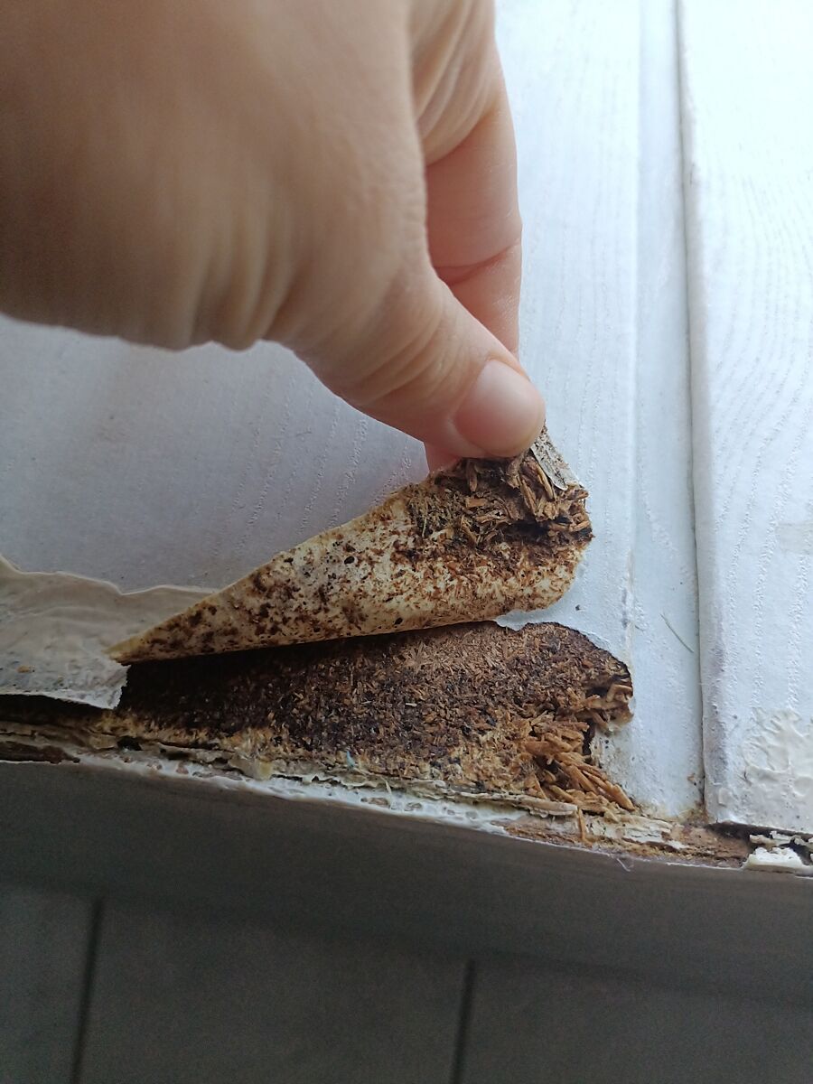 Переехали в съёмную квартиру. На окне в ванной было поддутая обшивка в одном месте, я ее подковырнула, а там такое. Хозяин квартиры говорит, что ето оно потемнело от дождя ( окно на крыше и под наклоном) , а мне оно похоже на плесень. Сверху плесени не было. Что ето, как понять?