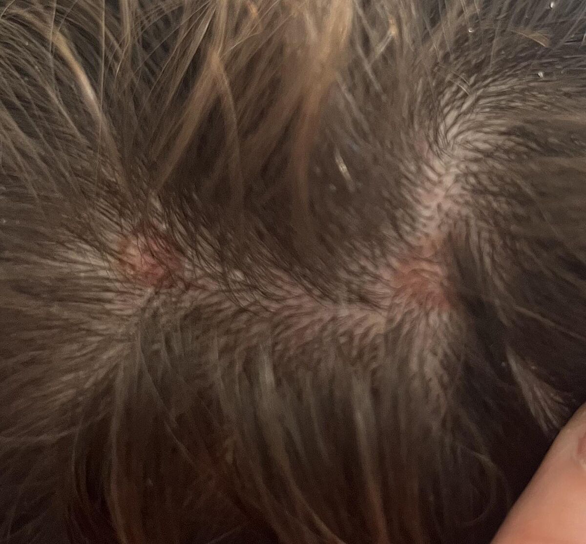 Я тут теж створювала тему, у сина таке появилось , поки миє шампунями бо мазями сам не може намастити, можливо це від стресу. Воно більше виглядає на запальне, за 2 міс сильно не змінилось