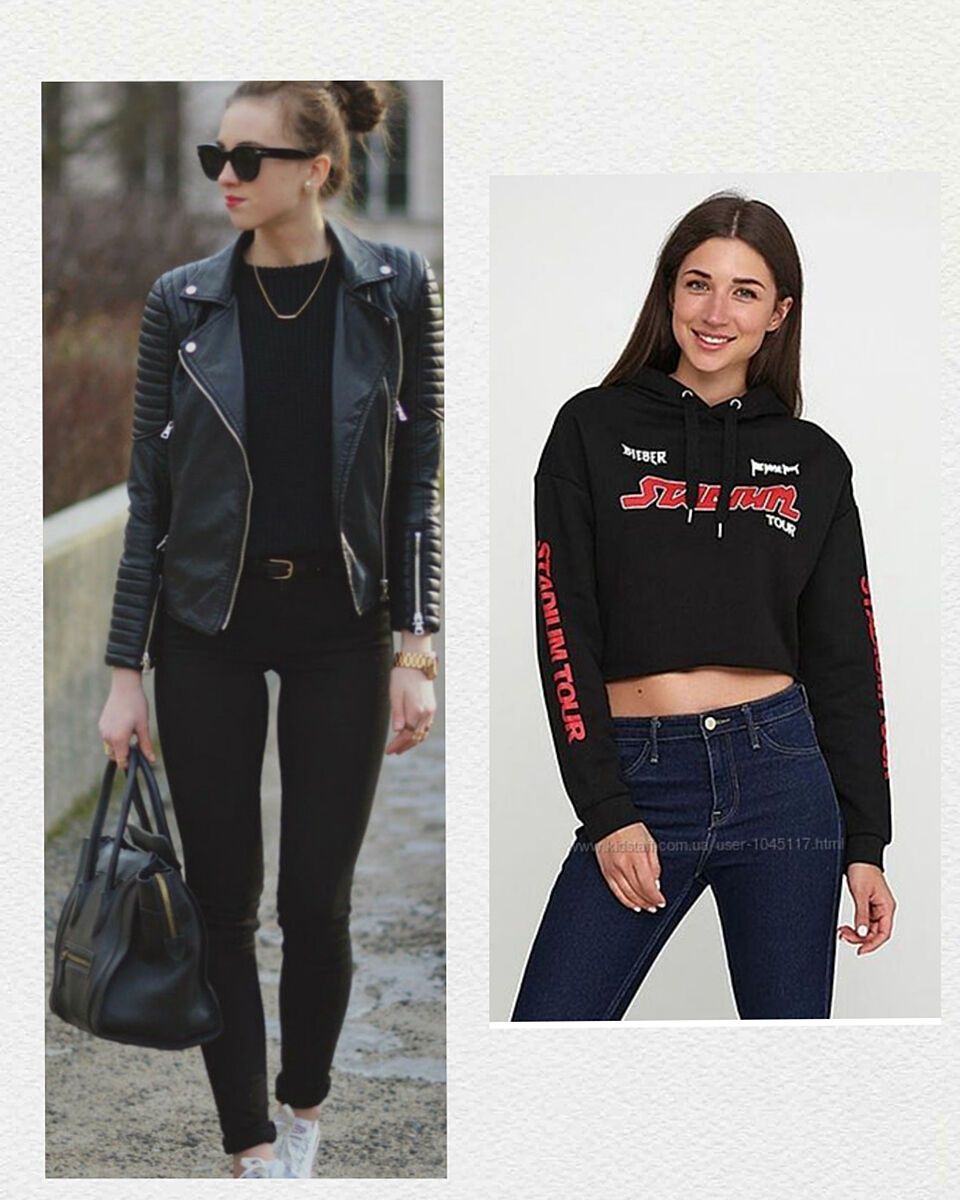 Пока только как на примерах фото - штаны скинни с короткой кожанкой и скинни с короткой широкой худи.