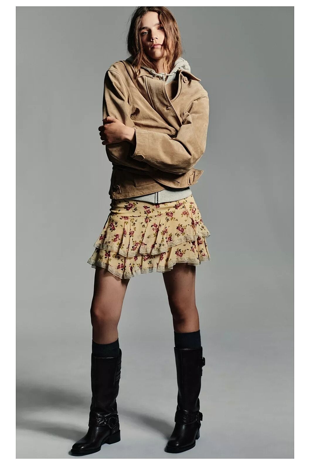 На фото с юбкой в цветочек юбку мысленно выбросили и поставили кожаную. Постарайтесь вообразить.