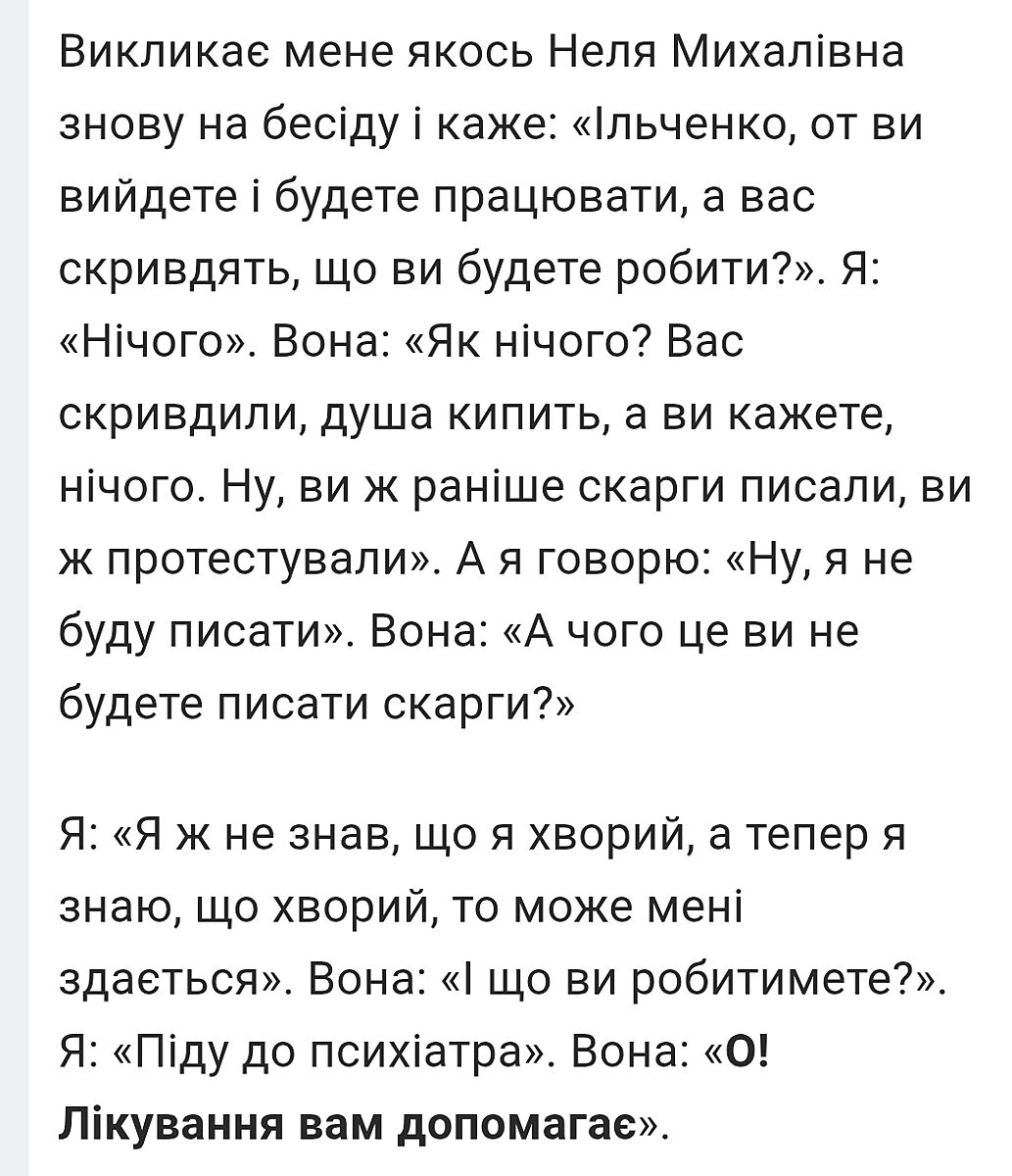 Я кажу: «Ну как – так, как будто бы в голову ваты натолкал». – «Да? Ага. Ну, а так вообще что-нибудь такое?» – «Да ничего такого нет». – «Вот если что-нибудь, обращайтесь к сестре или к санитарам». – «Зачем?» – «Ну, вы знаете, вы находитесь в надзорной палате». Відчувши, що я вповні здоровий, мужчина як мужчина, вона пішла геть».