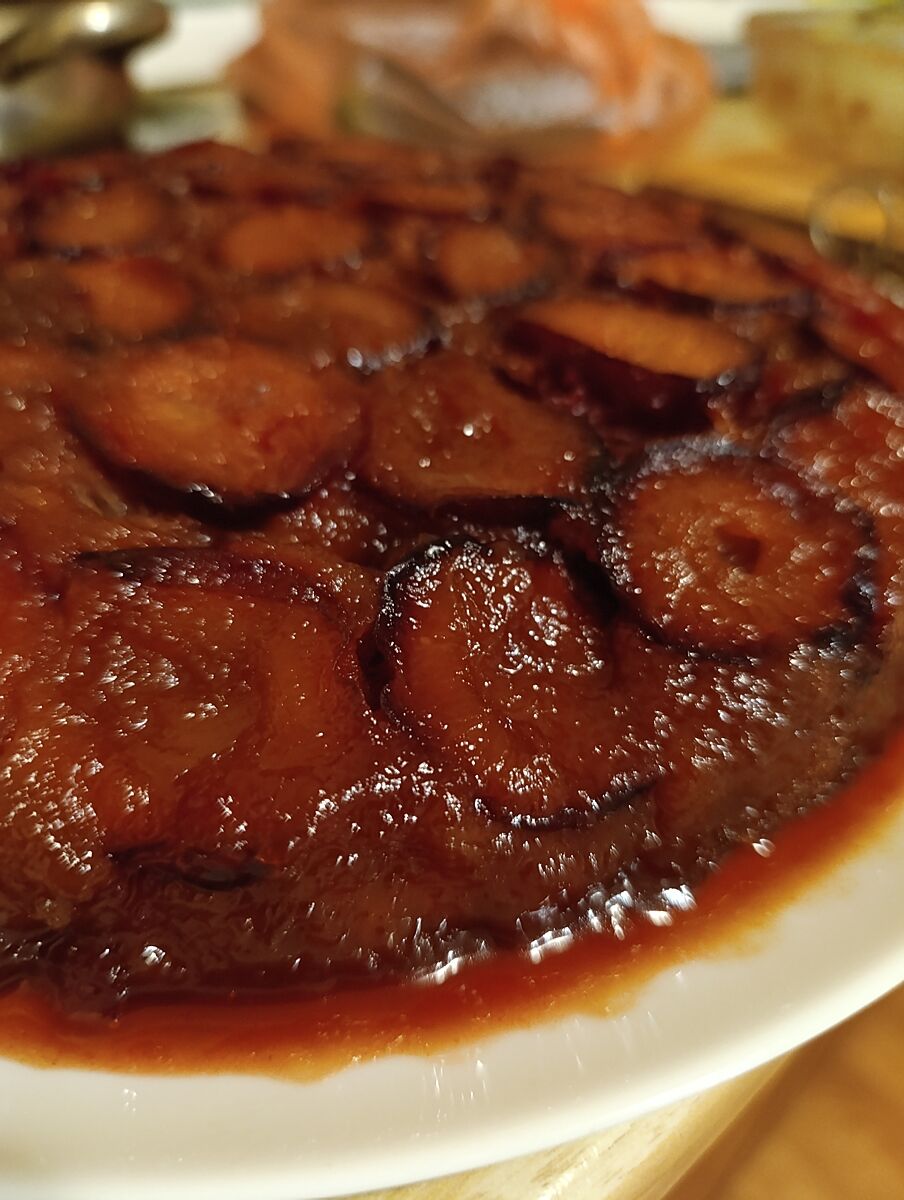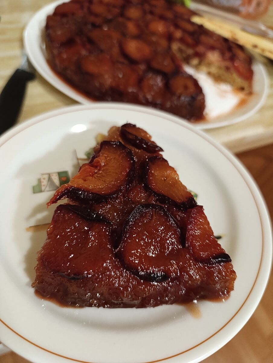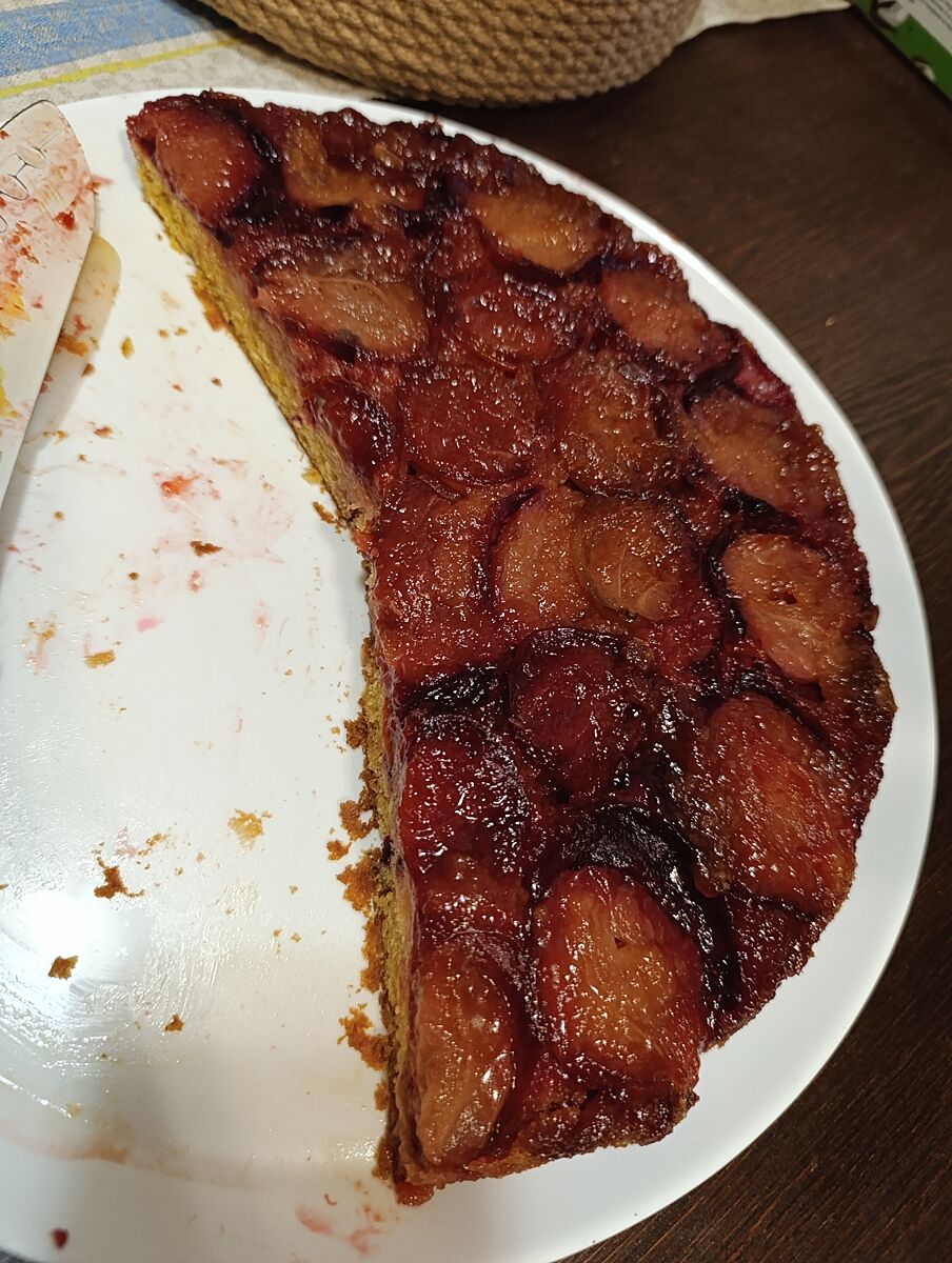 Я печу перевертиш. У формі прямо на плиті роблю карамель: цукор, шматочок масла, лимонний сік. Мішаю силіконовою лопаткою. Коли колір карамельний, відставляю з вогню і викладаю сливи, поливаю ложною рому чи якогось алкоголю, зверху заливаю тісто: