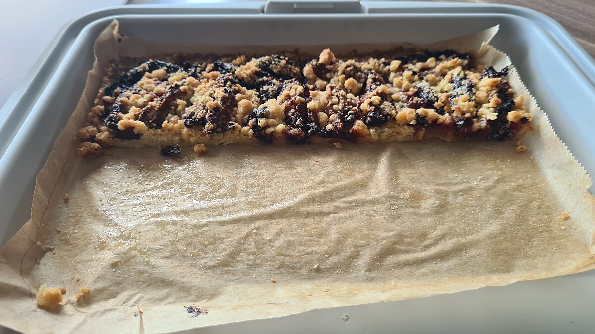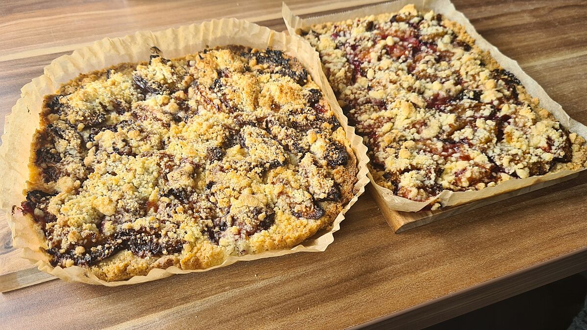 Викладаємо тісто в форму, зверху викладаємо начинку (сливи порізані на шматки, перемішуємо з цукром і крохмалем). Зверху по сливах посипаємо штрейзелем (перетерте борошно з цукром і маслом в крихту). Ставимо випікатися в розігріту духовку при температурі 180-190 градусів 45-55 хв. Даємо схолонути в привідкритій духовці а тоді дістаємо з форми і смакуємо.
