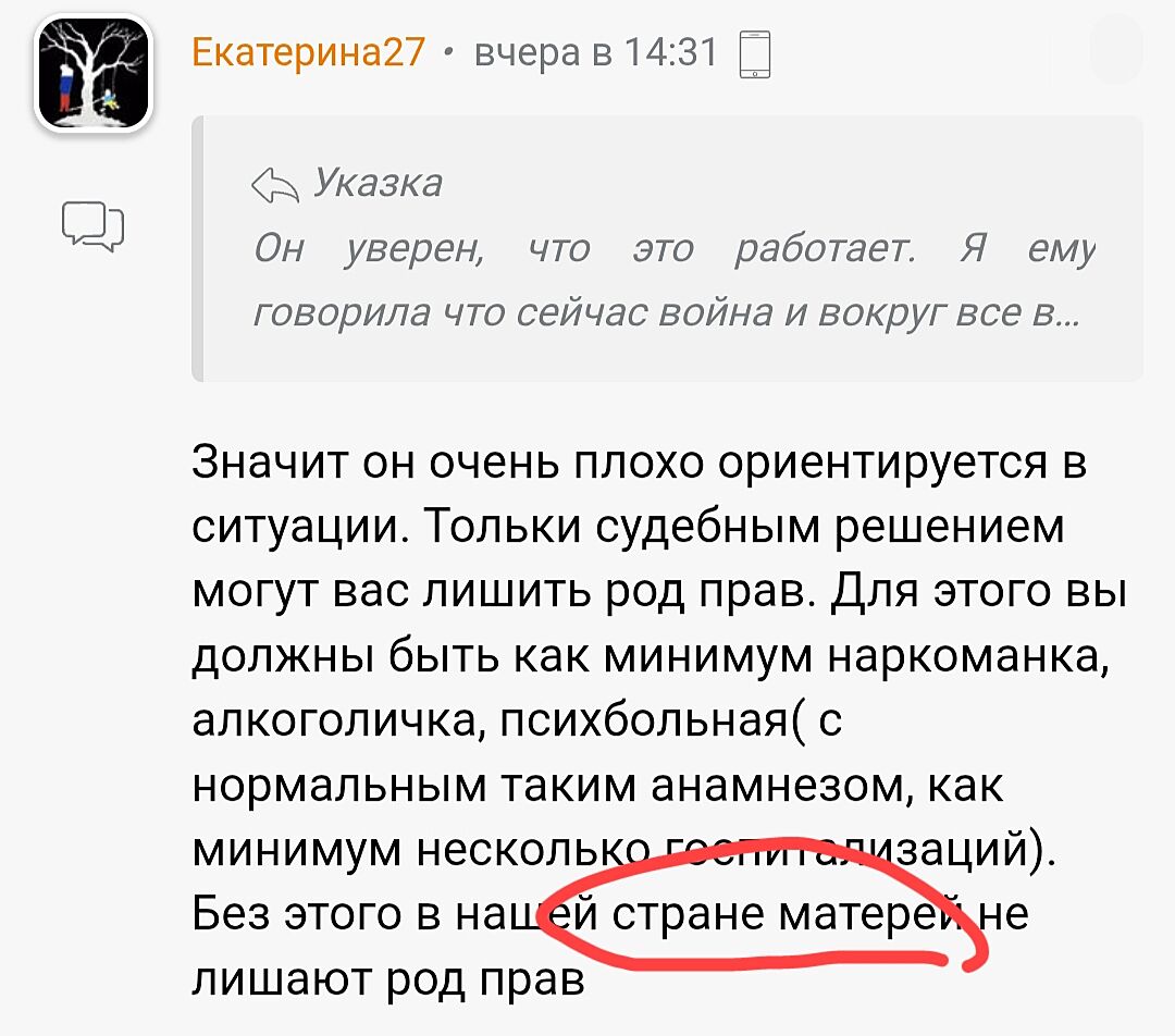 У меня нет такой ремарки)))) ни о какой «стране матерей» я не писала)))) а просто имела в виду, что лишить мать родительских прав а нашей стране может только при наличии уж очень веских оснований.