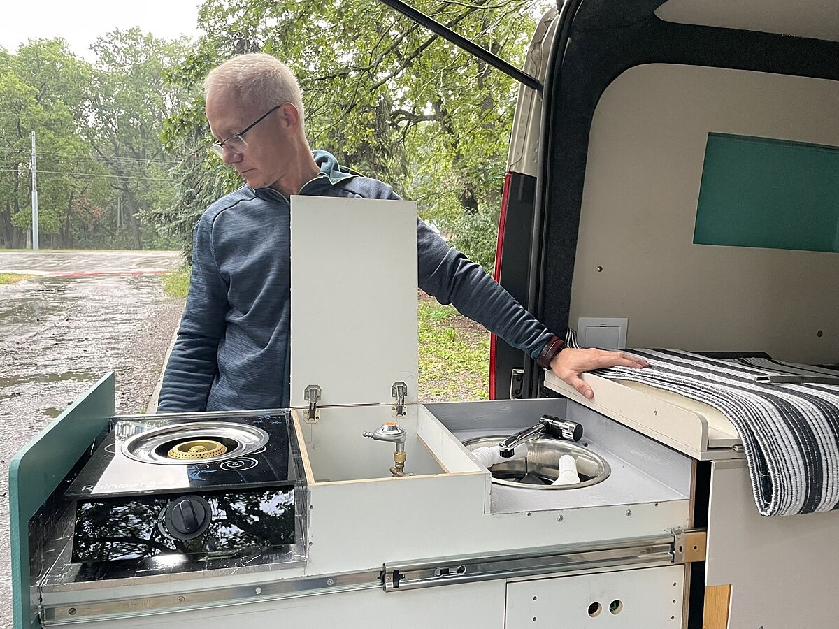 Понятно, что в таком маленьком кемпере душа нет. Только внешний, если место позволяет. Туалет будет био, пока не купили. Вода из мойки сливается в землю на природе или в ведро.