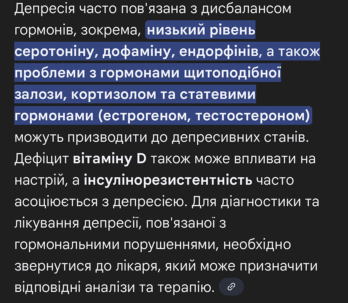 А здайте ще гормони. Комплексне лікування депресії краще починати з перевірки певних гормонів, дефіцитів вітамінів.