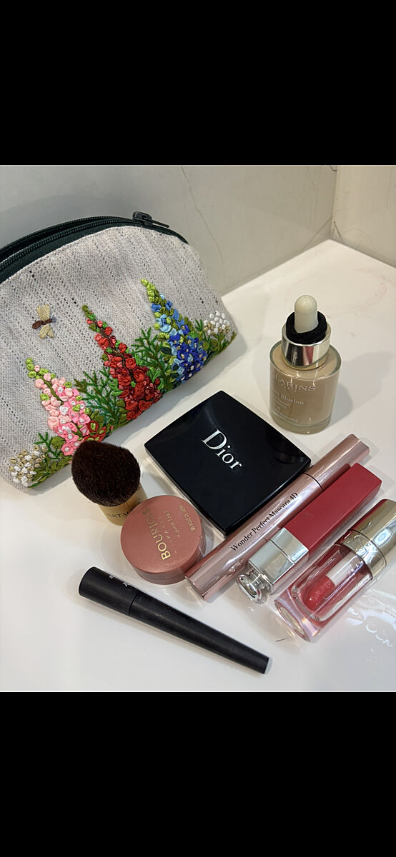 Ось вся моя косметика. Ще є Ланком помада нюдова, ланком олівець і діор максимайзер. Подобається дуже тональний. Clarins. Повторювала його кілька раз. Діло максимайзер теж хороший. Він не протікає в сумочці. Олійка від Діор була - постійно текла. Раніше в мене було ціла купа косметики бюджетної. Вирішила замінити якісною. Тепер поміщається в маленьку косметичку. Зручно)) а так я косметикою оідко користуюсь. Брови і вії у мене свої чорні. Вії без туші виросли, до речі, досить довгі і густі. Шкіра теж нормальна, особливо коли не забуваю кремом користуватись. А так, мені дуже подобається дорога косметика. Нею приємно користуватися, навіть просто баночку в руки взяти приємно.