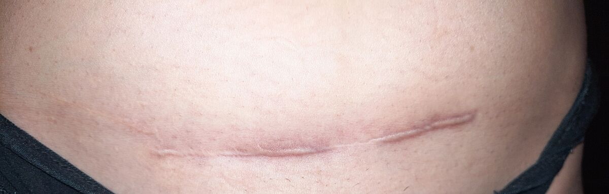 У меня было не кесарево, но полостная операция и шов такой же. Потом три беременности. Короче. У меня такого нет.