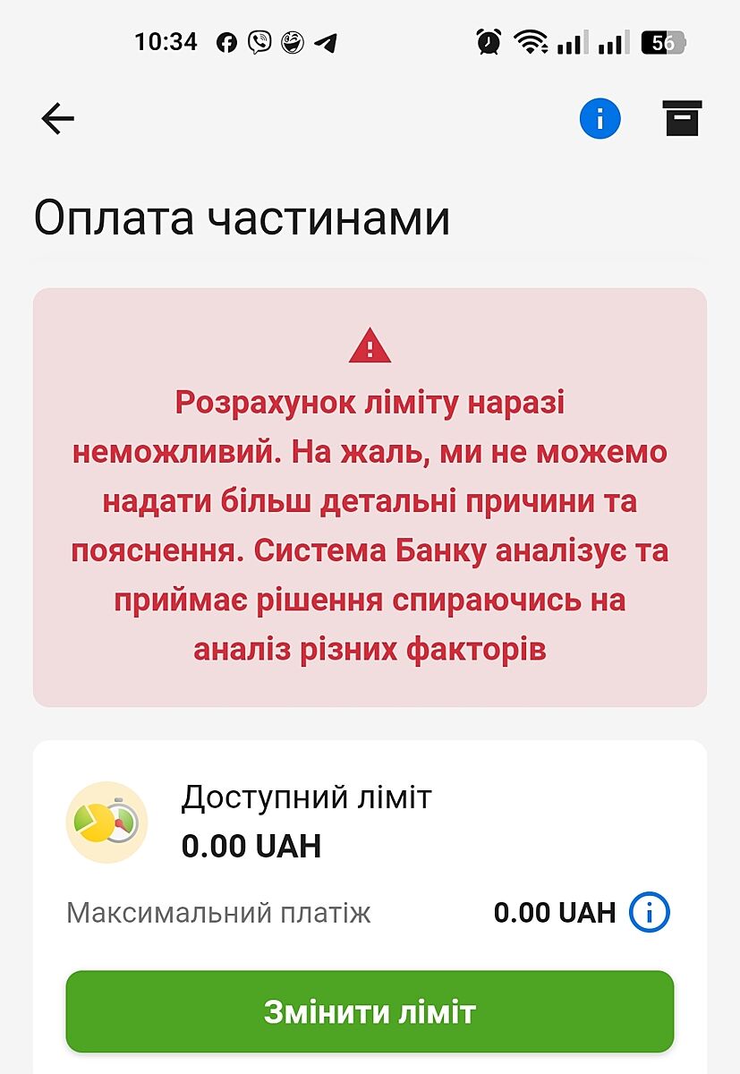 Сьогодні зайшла, у мене нема ліміту, пише (скрін) . До того було 30 000, операцій не робила з картою ніяких