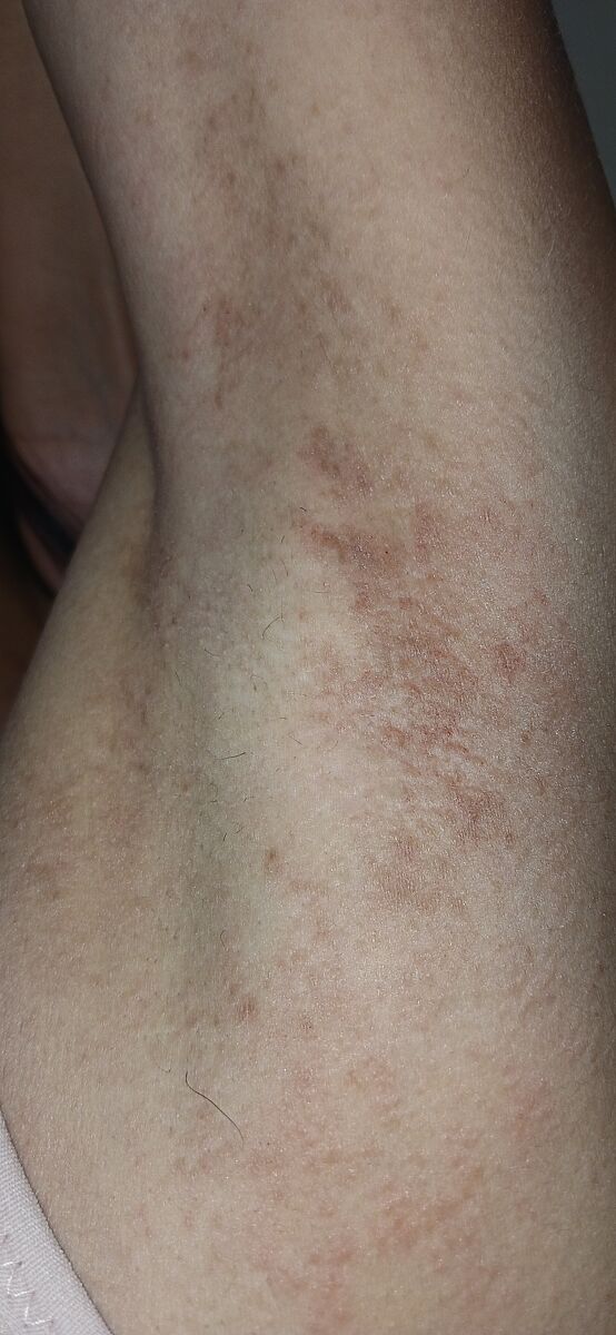Вибачаюся, що не поголено, там просто так чешеться і пече,що боюся бритвою лізти. Почалося з лівої пахви, десь через 8 днів і на правій почалося. Зудить трохи вдень, але найбільше вночі.