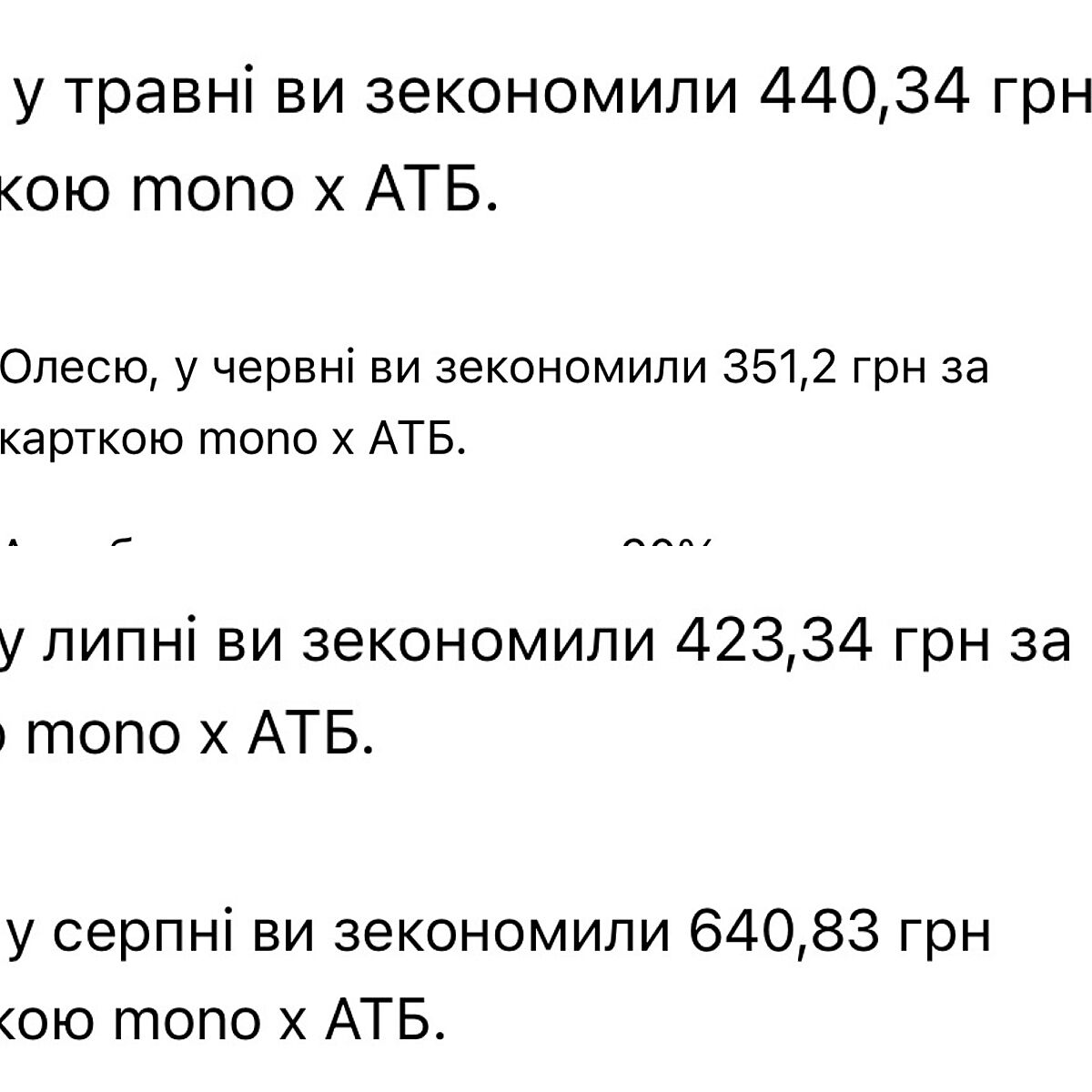 У мене монобанк, просто моя основна карта підключена до АТБ, вони прям звіт дають щомісяця