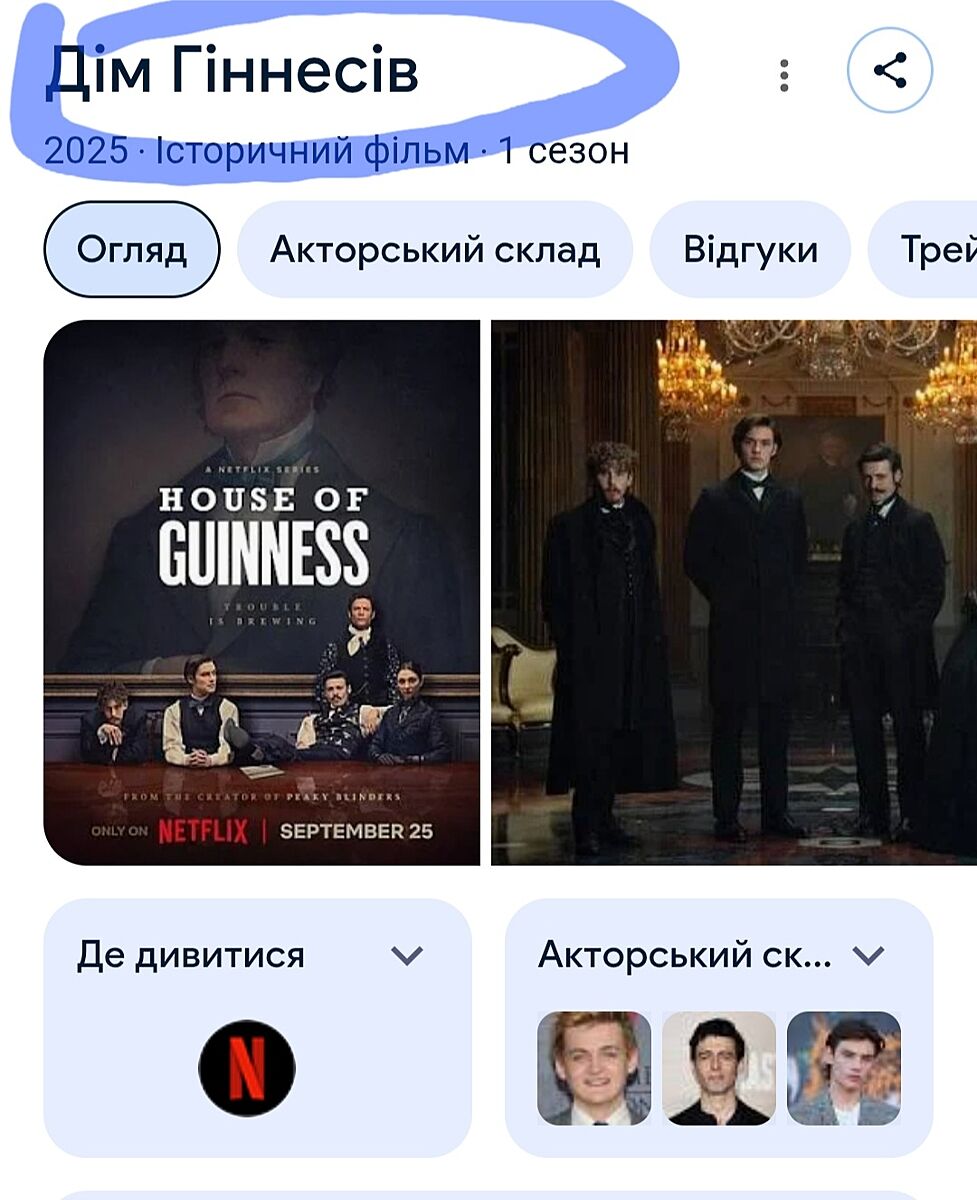 А на hdrezka этот же фильм Дом гиннесса. Как раз искала, что посмотреть из сериалов. Еще и живу сейчас в Ирландии, пиво Гиннесс для ирландцев - святое)
