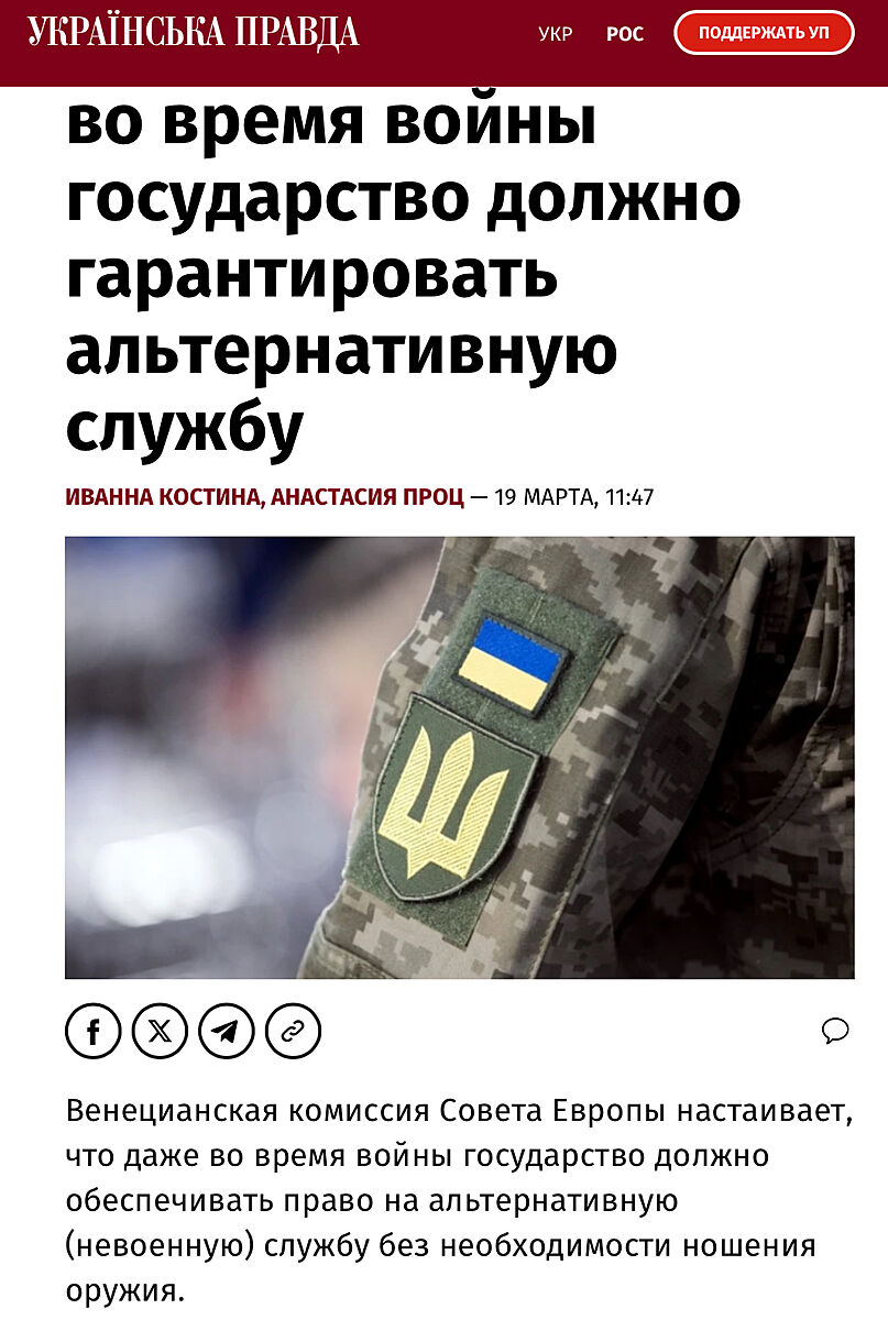 Венецианская комиссия Совета Европы настаивает, что даже во время войны государство должно обеспечивать право на альтернативную (невоенную) службу без необходимости ношения оружия. Прямая цитата