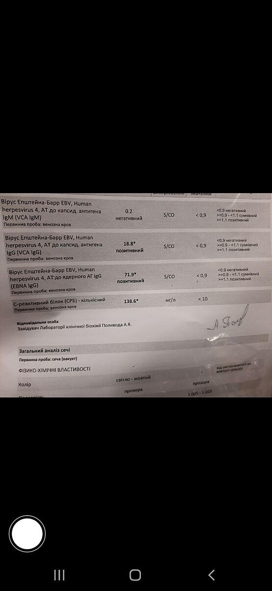 На фото – результаты анализа крови на вирус Эпштейна-Барр (EBV) и С-реактивный белок (СРБ).
