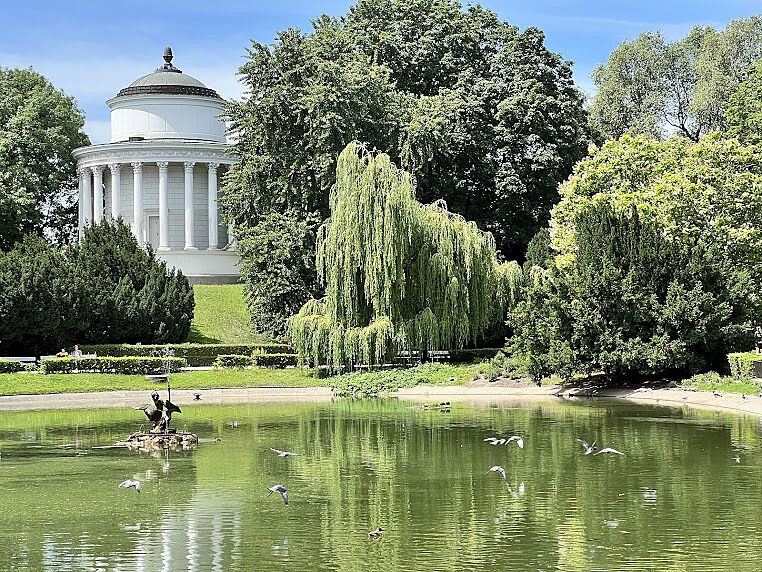 На изображении запечатлен Леопольд-парк, расположенный в Европейском квартале Брюсселя. Этот парк в английском стиле известен своими пологими газонами, извилистыми дорожками, прудом и примечательными деревьями.