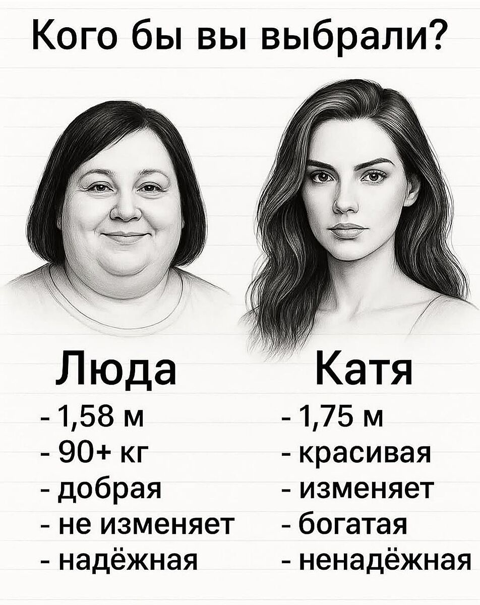 видела такую картинку и для девушек, с двумя парнями и идентичным описанием. красавчик богатый, но изменяет и ненадежный, а пухляш добрый, порядочный, но без денег.