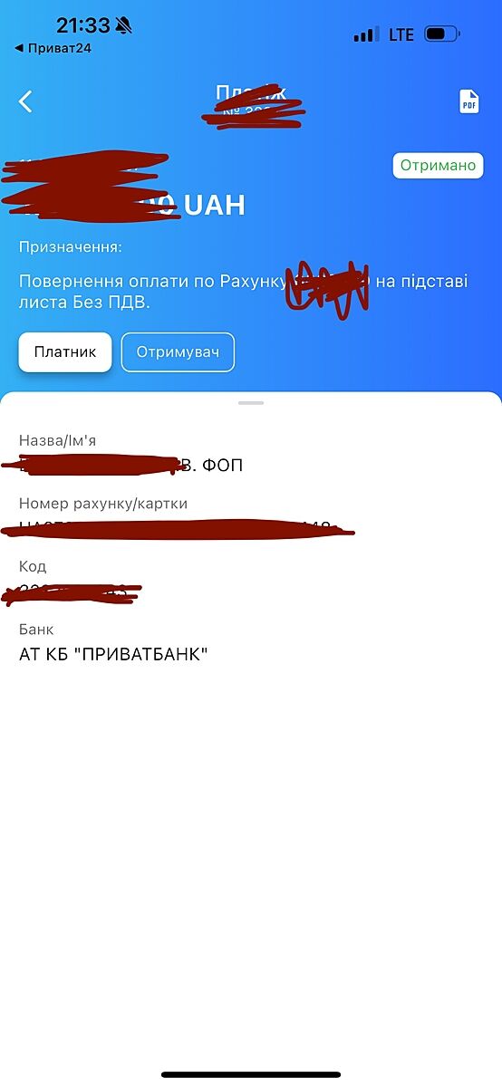 Податок з доходу з фоп 3 група (5%) , повернули грн на карту фоп за товар
