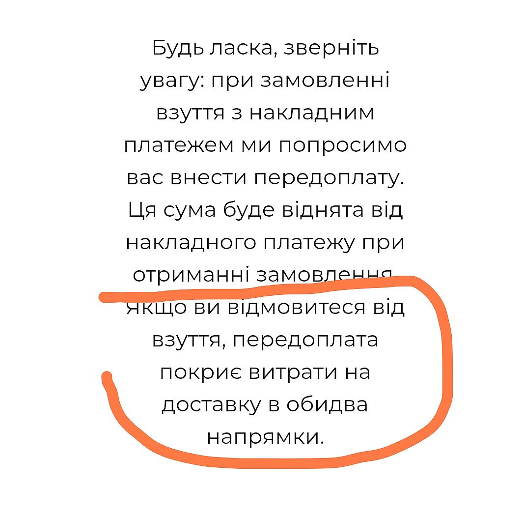 Будь ласка, зверніть увагу: при замовленні взуття з накладним платежем ми попросимо вас внести передоплату. Ця сума буде віднята від накладного платежу при отриманні замовлення. Якщо ви відмовитеся від взуття, передоплата покриє витрати на доставку в обидва напрямки.