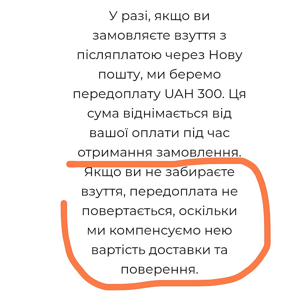 У разі, якщо ви замовляєте взуття з післяплатою через Нову пошту, ми беремо передоплату UAH 300. Ця сума віднімається від вашої оплати під час отримання замовлення. Якщо ви не забираєте взуття, передоплата не повертається, оскільки ми компенсуємо нею вартість доставки та поверення.
