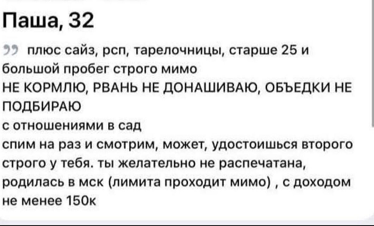 Я по многим параметрам не прохожу, не видать мне Паши как своих ушей :)))))