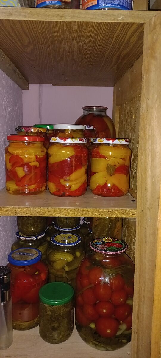 Джем из красной смородины, огурцы, помидоры, лечо,томатный сок, баклажаны и т.д. всего много, т.к. был урожай хороший. Раньше огородом и консервацией не занималась, но в 22 году переехали и вот так