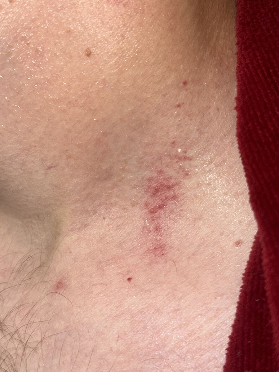 Засос. В крайнем случае у моего засосы именно так выглядят. И если бы у него были бы какие то кожные болячки, вы были бы с их проявлениями знакомы. Засос. На плаху.