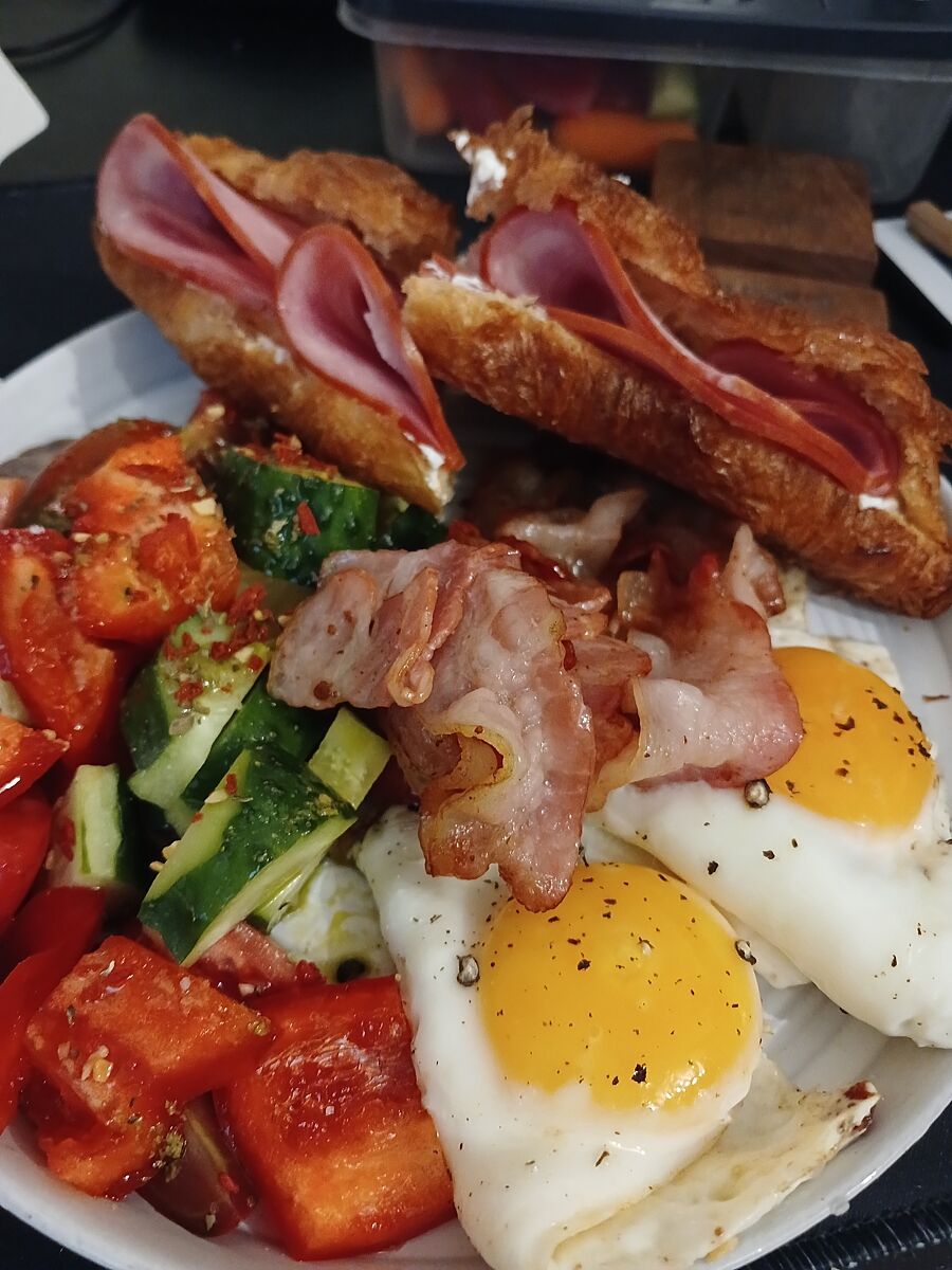 Утром был кофе, с бутербродом из авокадовой намазаи, перекус салат помидоры огурцы, обед тушёная говядина с картошкой, ореховый суп. Сейчас что-то сладкое слопаю. На ужин запеченая рыба с рисом и овощами.