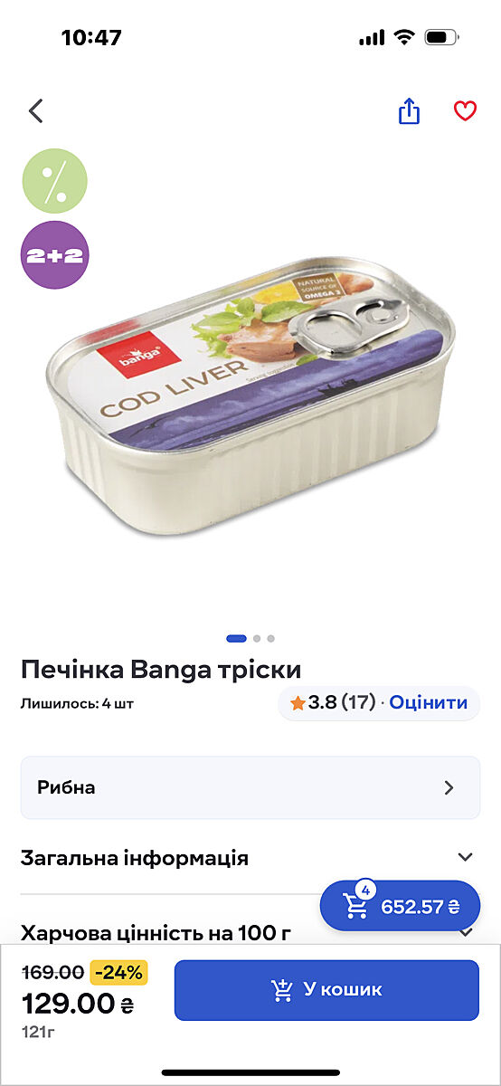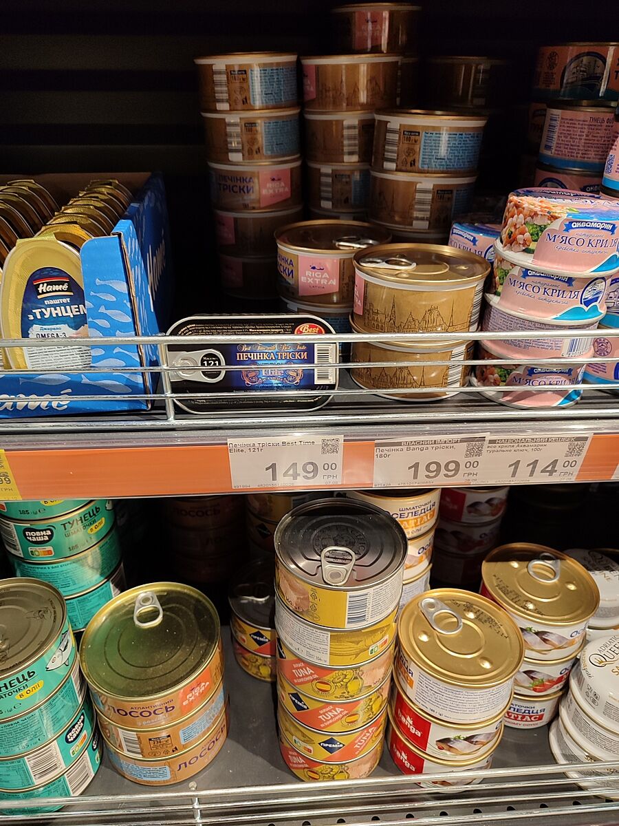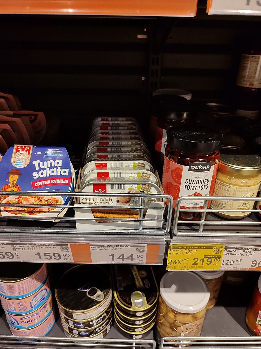 у нас нет такого вообще. ни тунца ни печени.я взяла другой тунец, икру кабачковую, фасоль. и 4 грибов разных вышли по 50 грн