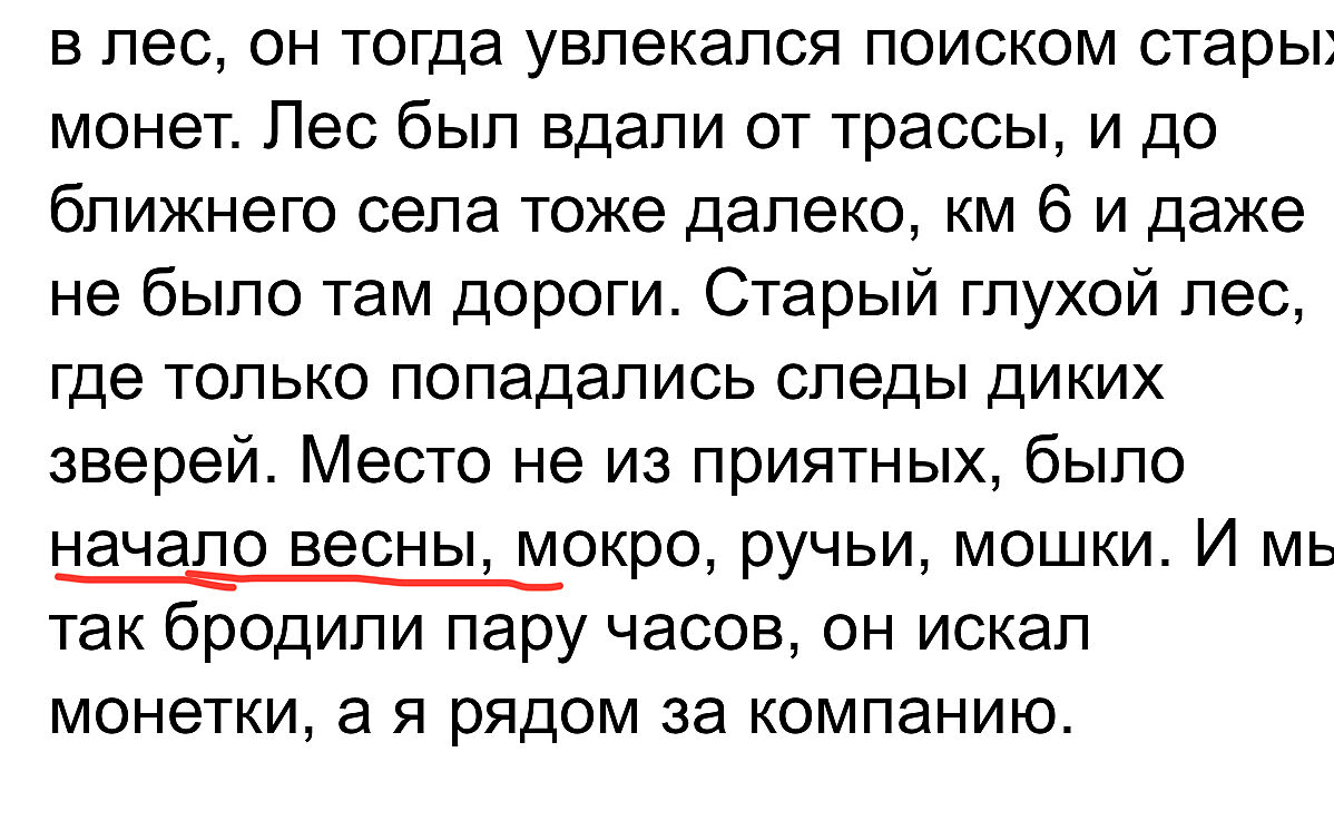 Девочки, вот вспомнилась ситуация и до сих пор не могу понять что это было. Лет 10 назад я с другом поехала за компанию в лес, он тогда увлекался поиском старых монет. Лес был вдали от трассы, и до ближнего села тоже далеко, км 6 и даже не было там дороги. Старый глухой лес, где только попадались следы диких зверей. Место не из приятных, было начало весны, мокро, ручьи, мошки. И мы так бродили пару часов, он искал монетки, а я рядом за компанию.