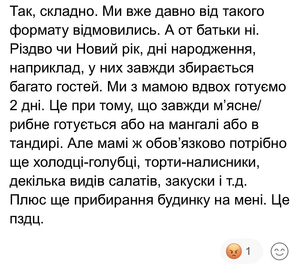 У меня мама и бабушка шикарно готовили, но кухню поделить не могли ) гостей это обычно 15 + человек и нас 5 , короче ну его в опу те застолья , могу встретить брата и его семью , но тут реально все по домашнему ( живем в разных городах )