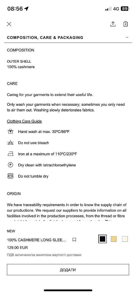 Ну вот. Там где натуральный состав в заре и цена соответствующая 129 евро. То что вы скинули по 50 евро там скорее всего намешано что-то или переработанное, они просто не признаются, надо смотреть доп этикетки на самом изделии . Но я трогала там пальто из шерсти, они страшно колючие и жесткие, это очень низкого качества шерсть