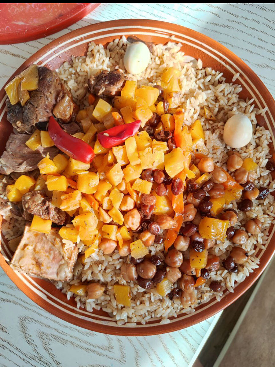 А еще он как то нас угостил пловом с нутом. Все то же, как в обычном плове+нут, его нужно с вечера замочить и отварить до полуготовности, потом в плов. Я сначала подумала что это орешки