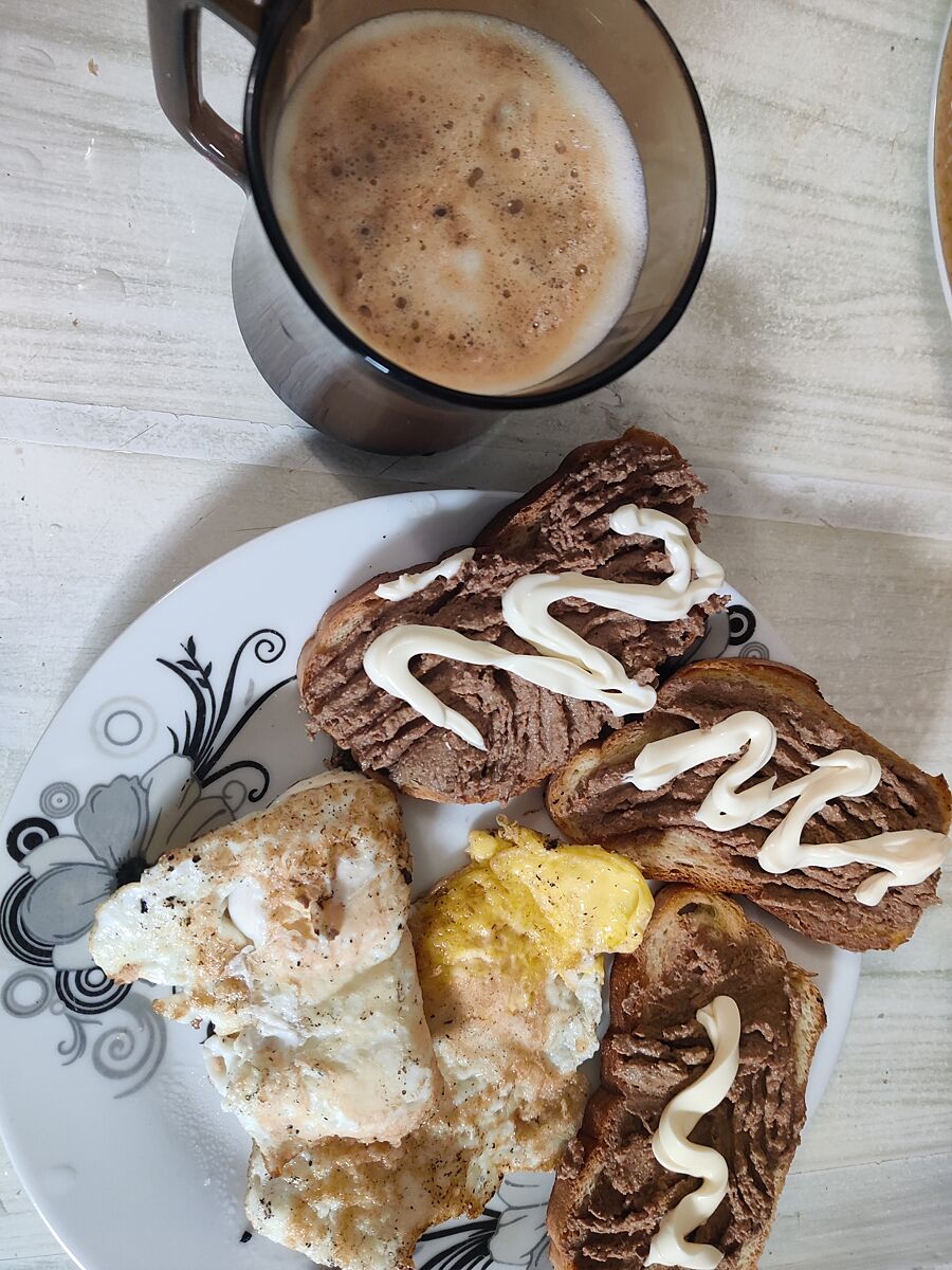 Бутерброд и кофе, сладкое есть с утра не могу, тошнит, а вот часов с 10 на работе йогурт или что то сладкое и кофе то ок