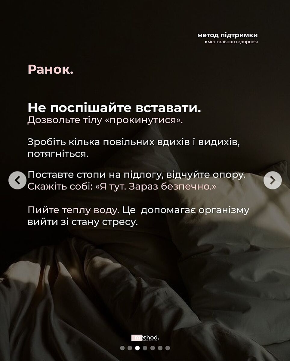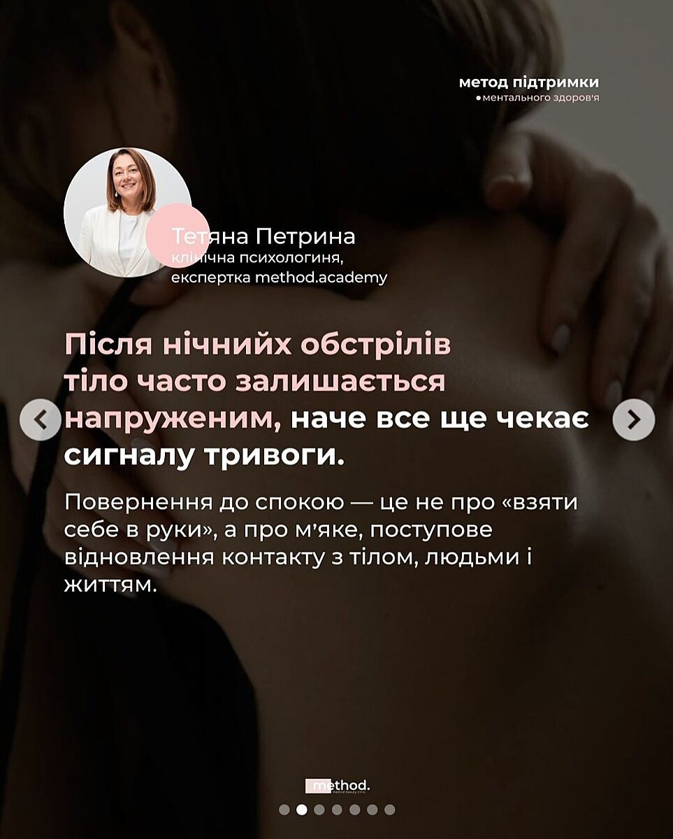 Объясню, советы на самом деле работающие и важные. После ночного обстрела мы часто не успеваем восстановиться, нам нужно бежать дальше - работа, дела. Все это напряжение остаётся в теле, весь этот пережитый страх - с нами. 10 минут ничего не изменят, если уделить их на то, чтоб подышать, почувствовать опору и выпить теплой воды. Я бы ещё посоветовала попрыгать, размяться, похлопать себя руками, потрястись - ’выгнать’ стресс из тела. Реально работает, хотя казалось бы - какая мелочь. Про вечер - стандартные советы для всех, ничего особенного. И понятно, что это не супер рекомендации и проработка на глубоком уровне, а просто базовые универсальные советы для всех