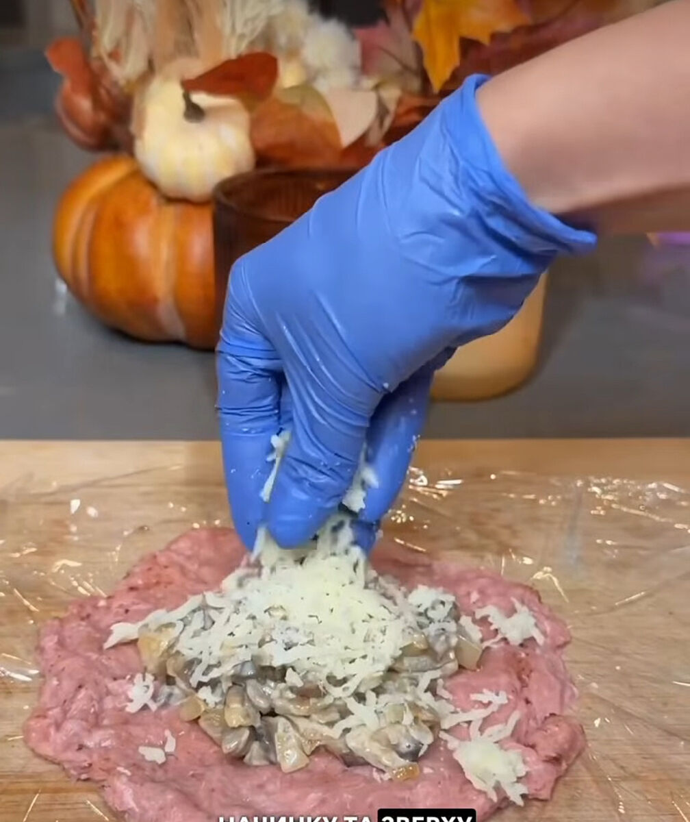 Буде воно купи триматися, якщо як на фото у фарш накласти грибів з сиром і закрутити в плівці, зняти плівку із сирого фаршу, обваляти в паніровці і запекти.