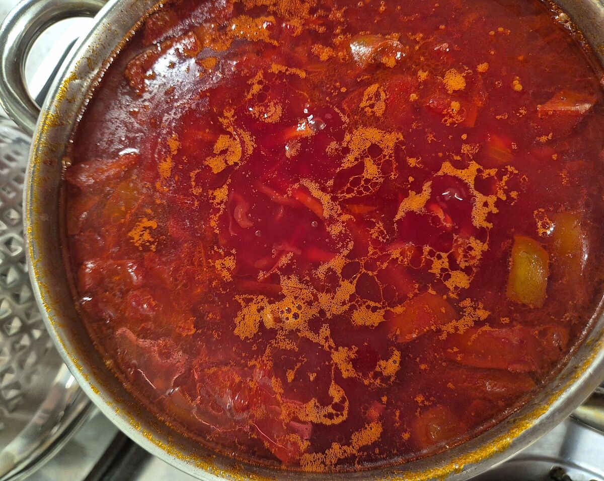 У меня борщ по-арабски. Муж первый раз готовил и получился очень густой, фоткать не буду, не аппетитно, но вкусно