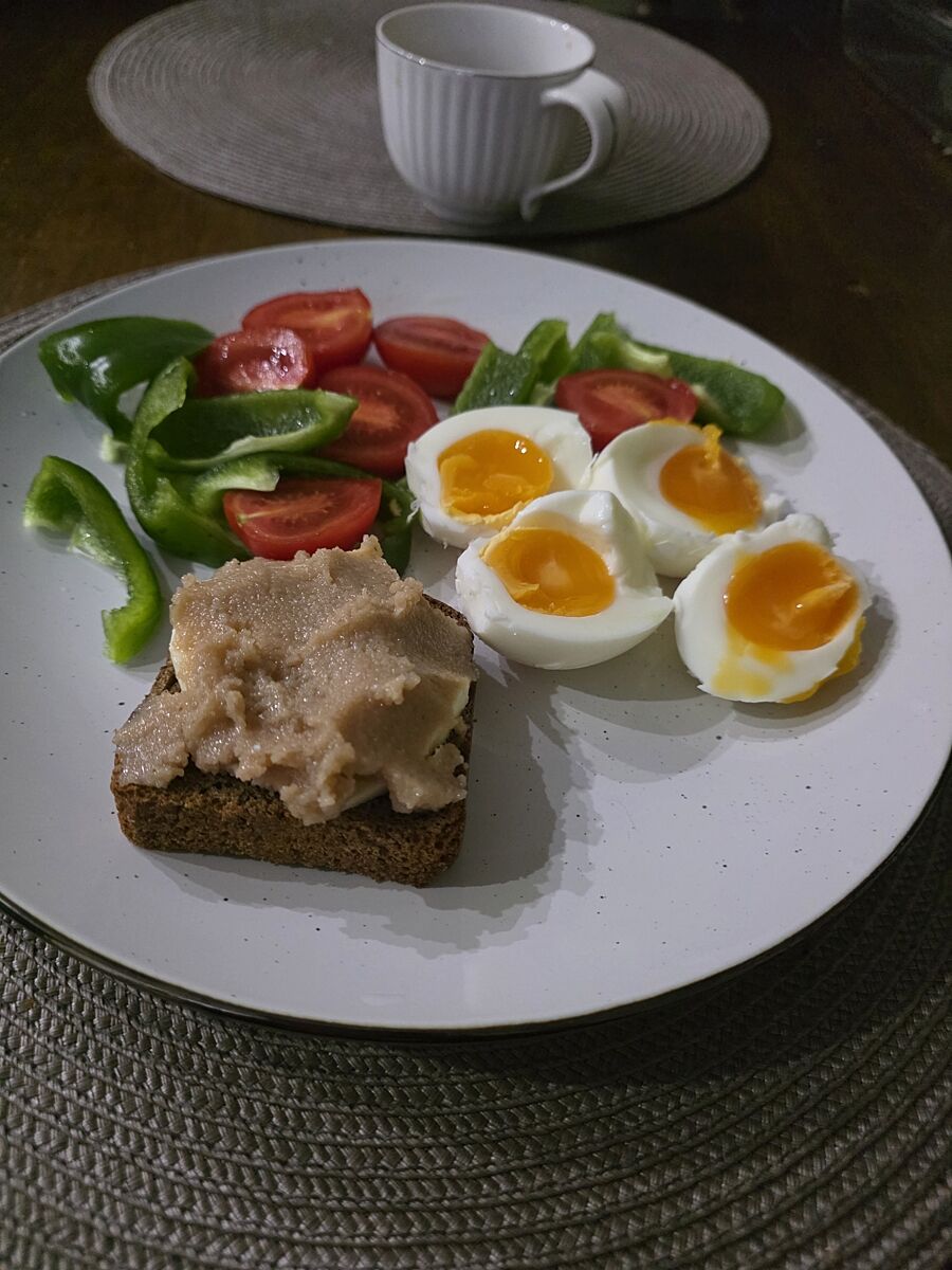 Черный кофе со стевией, яйцо всмятку, тост с печеночным паштетом.