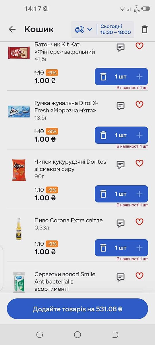 Я вибираю саме ці товари на доставку, але все одно не по 1 грн..