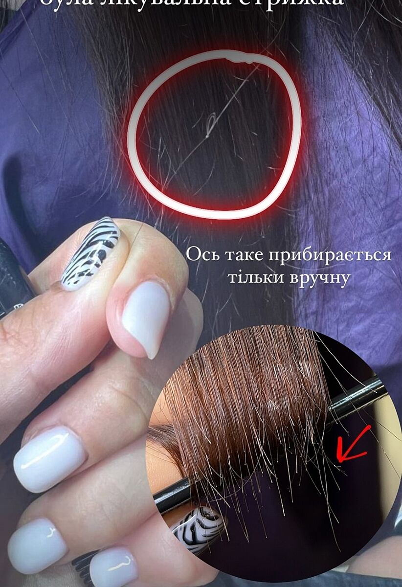 Вище додала фото. Майстер прибирає пошкоджене (посічене волосся) без втрати довжини і густини вручну.