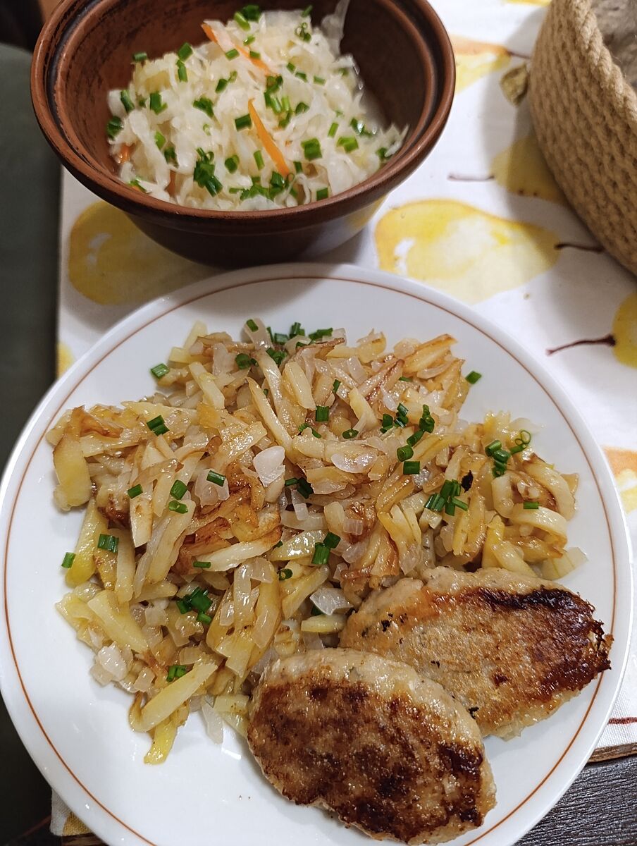 Каша рисова з м´ясом була. А зараз буду картоплю смажити