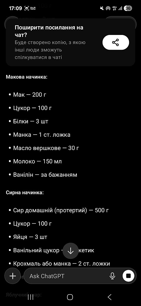 У меня есть. Открываете новую вкладку в браузере и гугдите ’пляцка Жозефіна з маку сира і тертих зверху яблук’ и вуаля